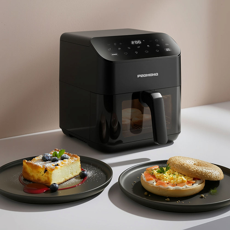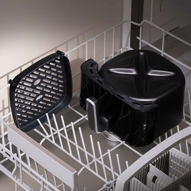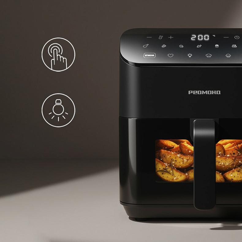 Сенсорная панель управления реагирует на легкое касание, позволяя выбирать программы и настройки без лишних действий. Благодаря подсветке внутри чаши можно в любой момент визуально оценить степень готовности блюда. Эти решения делают использование аэрогриля понятным и удобным.