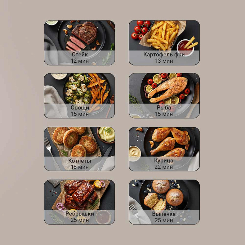 Программы для популярных рецептов сделают приготовление легким, а результат — предсказуемым. Выберите иконку с нужным блюдом на сенсорной панели, и аэрогриль автоматически установит оптимальные настройки времени и температуры. Стейк будет готов за 12, картофель фри — за 13, а выпечка — за 25 минут.