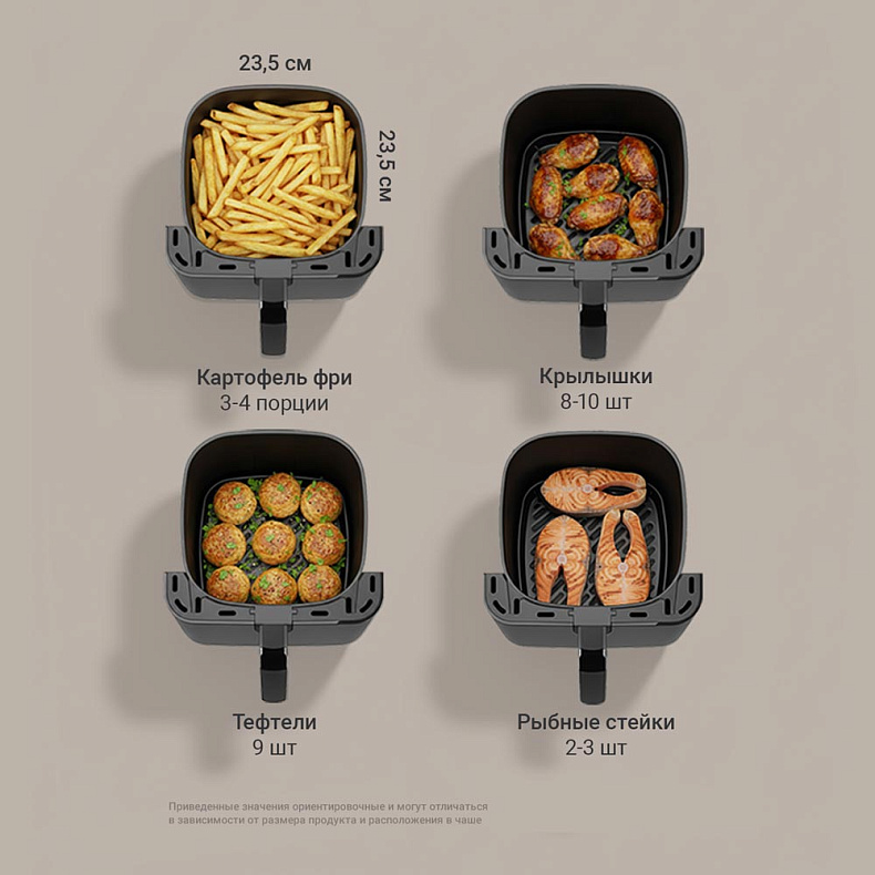 За один цикл в чаше объемом 5 литров можно приготовить полноценный обед на семью из 3–4 человек или набор закусок для встречи гостей. Размеры 23,5×23,5 см позволяют разместить до 8–10 куриных крылышек, 3–4 порции картофеля фри или 9 тефтелей*.