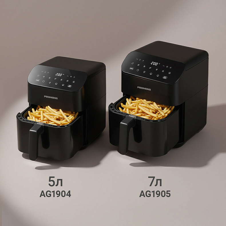 Аэрогрили AG1904 и AG1905 идентичны по функциям и отличаются только объемом чаши. Если вы цените компактность, модель AG1904 с 5-литровой чашей — ваш вариант. AG1905 с увеличенной чашей на 7 литров подойдет тем, кто готовит на большую семью и часто собирает гостей.