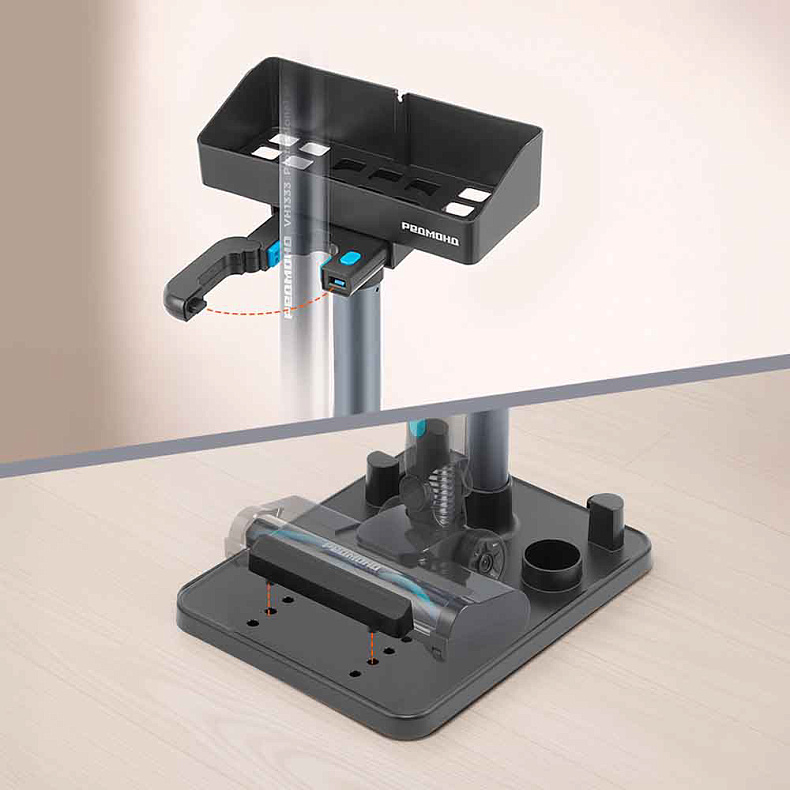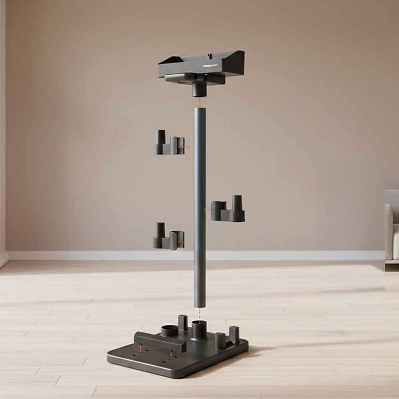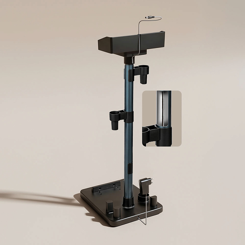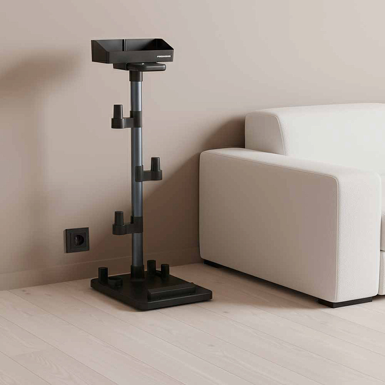 Универсальная подставка создана для того, чтобы компактно разместить вертикальный пылесос и комплект аксессуаров в одной зоне. Больше не придется прятать насадки в шкаф — все необходимое всегда под рукой и готово к использованию.