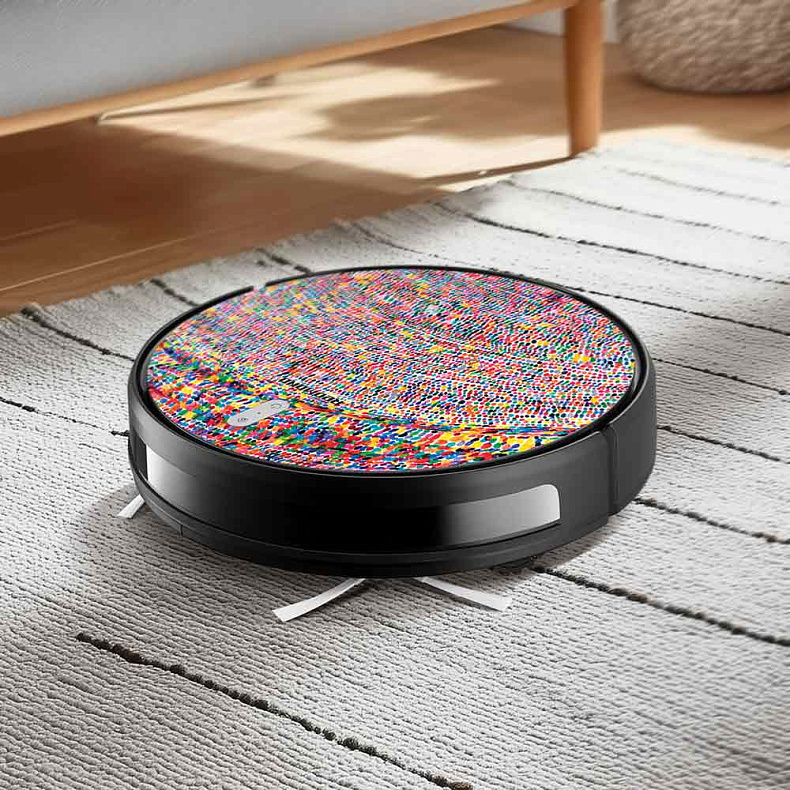 Панель с оригинальным принтом сделает из вашего робота-пылесоса объект искусства. Рисунок на крышке не только яркий, он еще и наполнен смыслом, ведь его автор — подопечный из фонда «Перспективы».