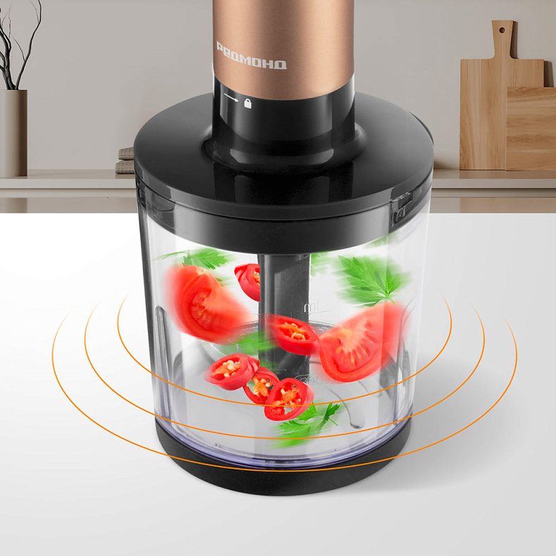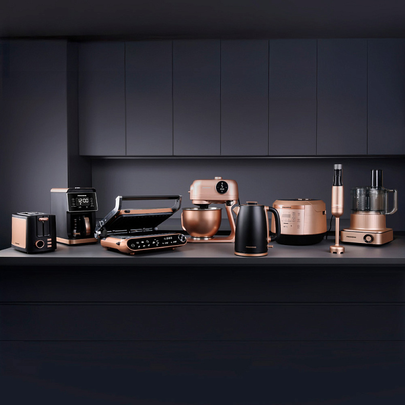 Блендер BH403 выполнен в трендовом бронзовом дизайне — и входит в коллекцию техники Peach Bronze. Он сочетает стиль и функциональность, как и другие приборы из этой линейки: гриль GM303, электрический чайник KM240, кофеварка CM720, кухонная машина FM615 и комбайн FP608, а еще тостер T901 и мультиварка RMC-450.
