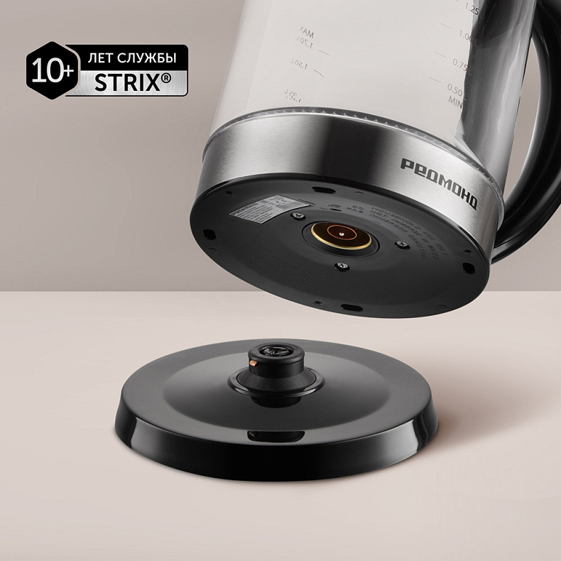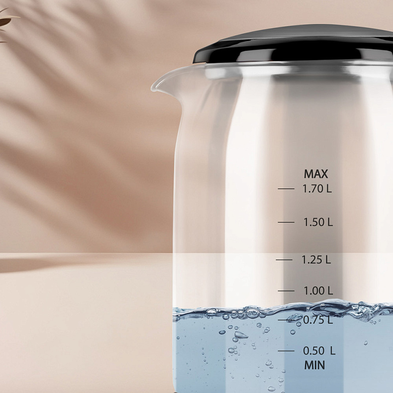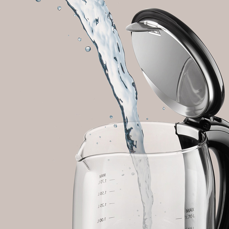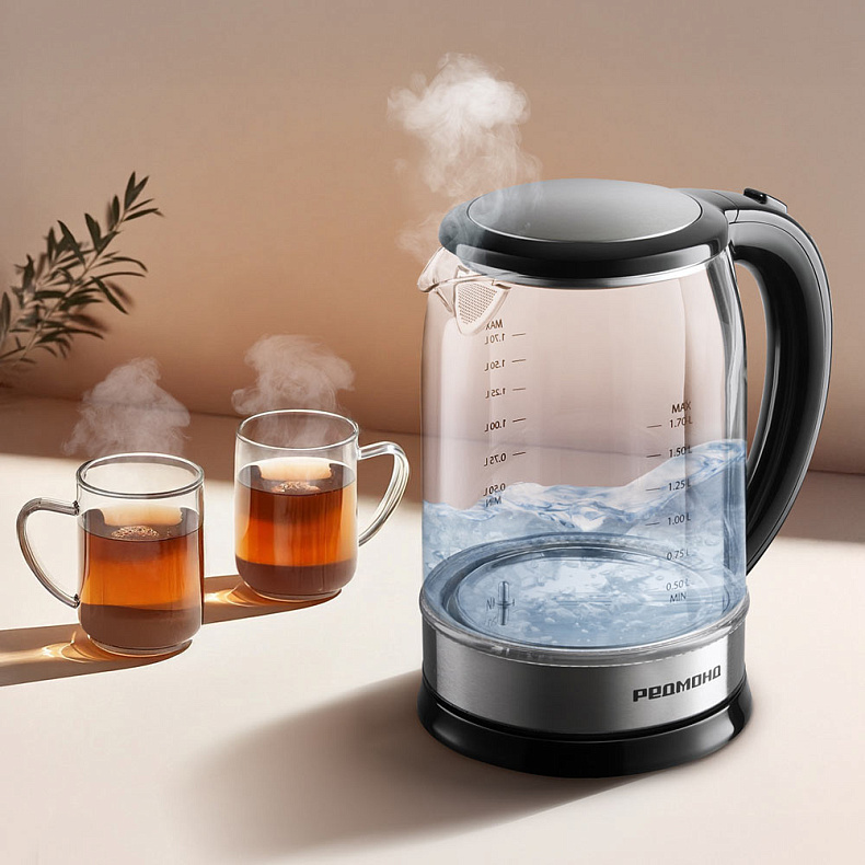 Колба выполнена из прочного термостойкого стекла. Даже при постоянном нагреве она не выделяет вредные вещества. Объема 1,7 л хватит на 6–7 кружек чая, что удобно для большой семьи.