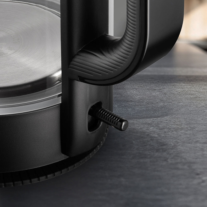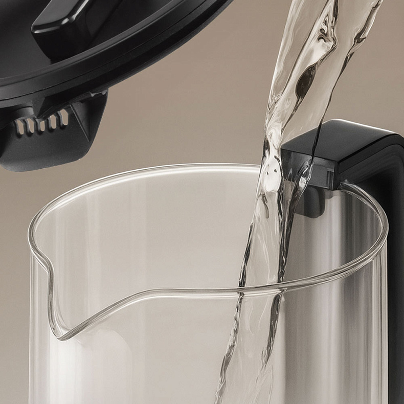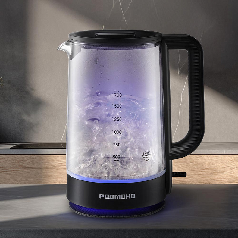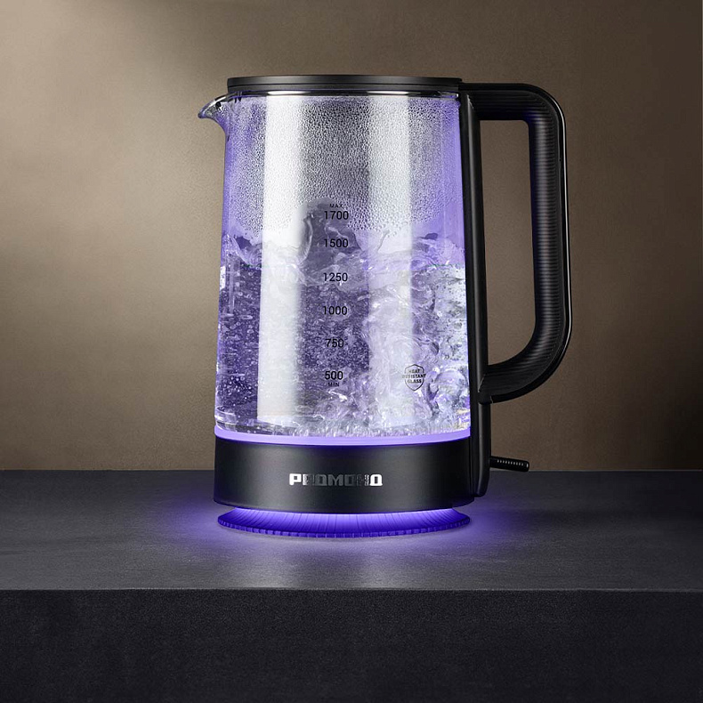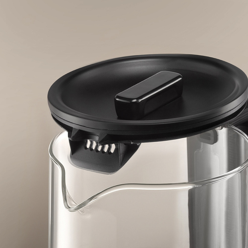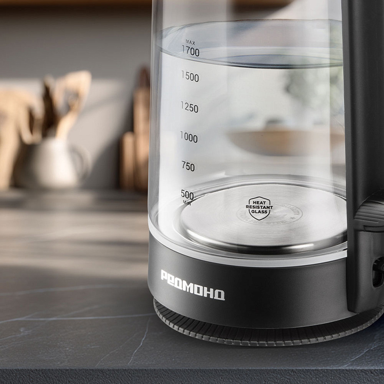 Колба чайника изготовлена из термостойкого стекла. Материал не выделяет вредных примесей, поэтому пользоваться устройством безопасно. Стекло не влияет на вкус воды — напитки получатся идеальными, без запаха пластика.