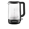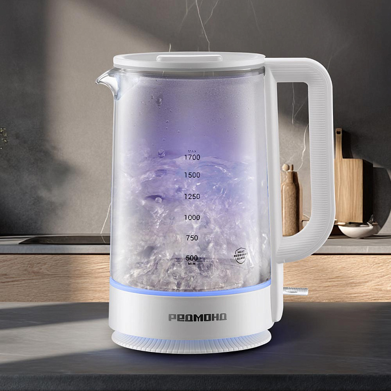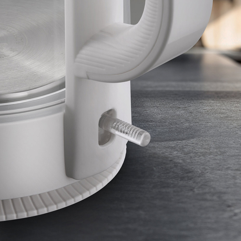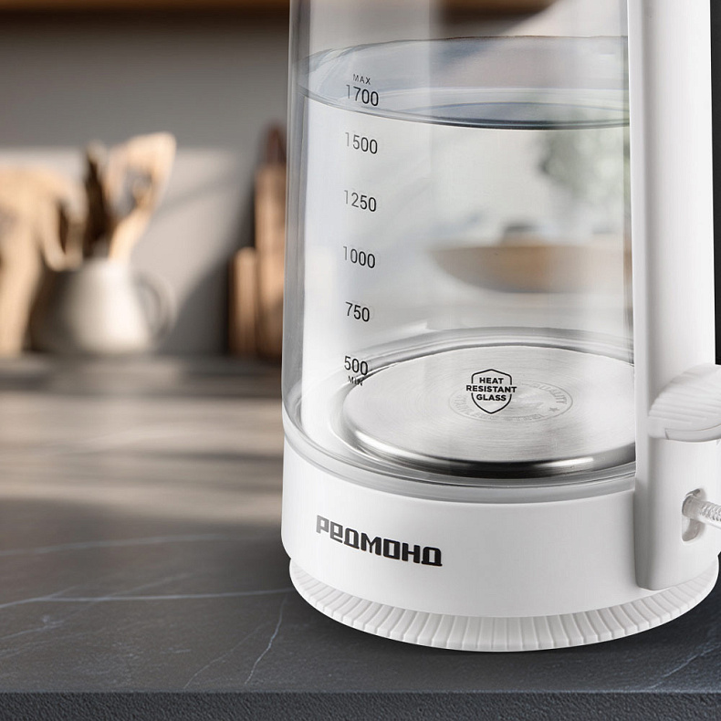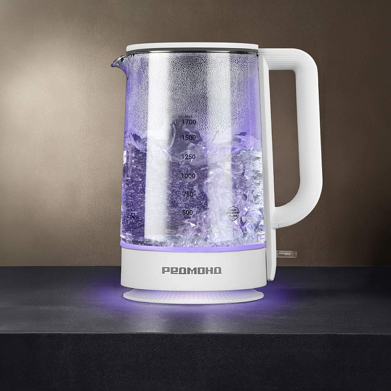 Колба чайника изготовлена из термостойкого стекла. Материал не выделяет вредных примесей, поэтому пользоваться устройством безопасно. Стекло не влияет на вкус воды — напитки получатся идеальными, без запаха пластика.
