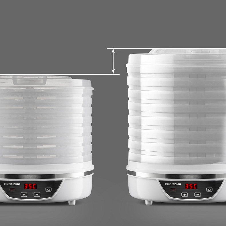 В сушилке можно идеально обработать как маленькие кусочки фруктов и овощей, так и более крупные. Высота поддонов регулируется вручную, нужно просто поставить их друг на друга определенным образом.