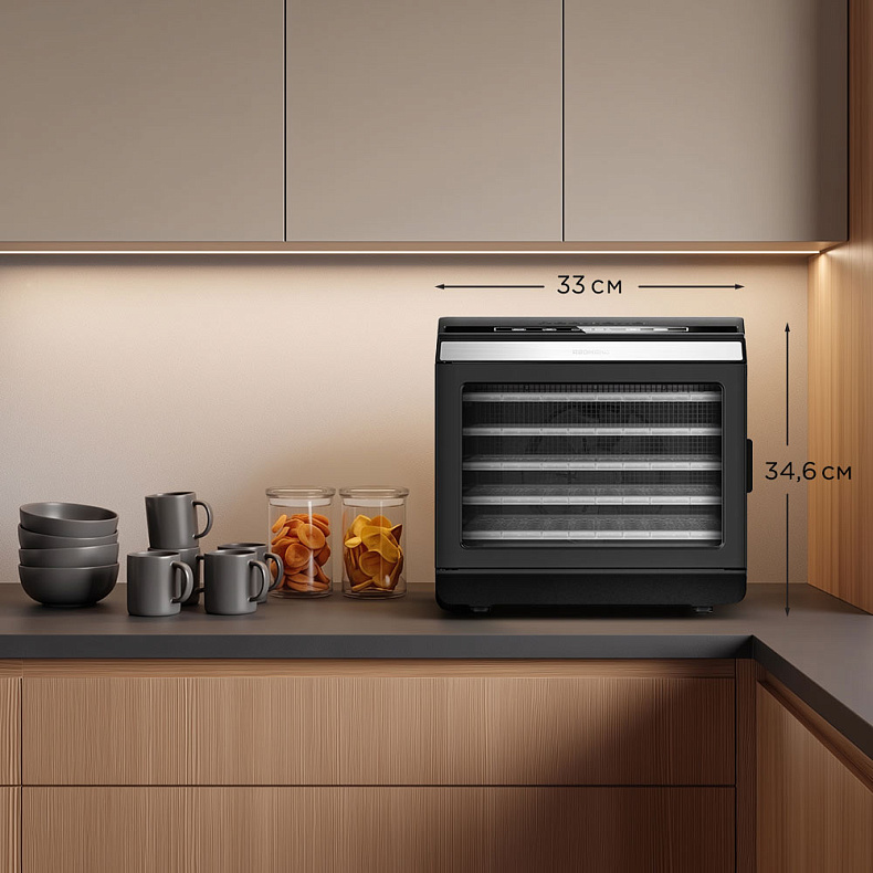 Сушилка сочетает вместительность 25 литров и компактные габариты. Ширина корпуса — 33 см, высота — 34,6 см, поэтому прибор легко разместится на кухонной столешнице и гармонично впишется в интерьер. При этом внутри достаточно пространства, чтобы приготовить запас сушеных фруктов или грибов сразу для всей семьи.