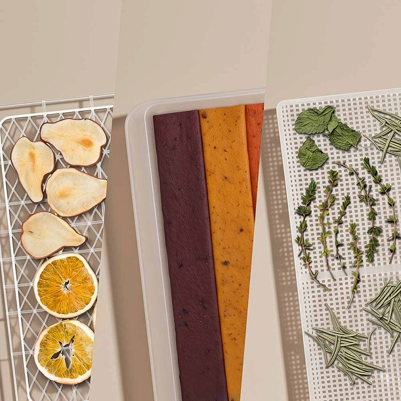 В комплекте есть 6 решеток для сушки, 6 поддонов для пастилы и 6 мелких сеток для трав — вы сможете одновременно готовить разные продукты и экономить время. На решетках удобно сушить яблоки, бананы или грибы, на сетках — ароматную зелень и травы, а на поддонах легко приготовить домашнюю пастилу из ягодного пюре. Например, за один цикл можно высушить фрукты для компота, травы для чая и приготовить полезное лакомство для детей.