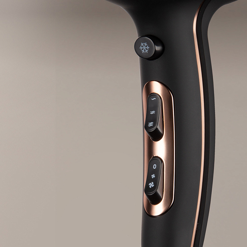 Фен оснащен 3 температурными режимами и 2 скоростями обдува, что позволяет подобрать оптимальные настройки для любого типа волос. Максимальная температура подойдет для густых и вьющихся волос, умеренный нагрев — для нормальных, а минимальный режим обеспечит щадящую сушку тонких и ослабленных волос. 2 скорости обдува позволяют выбрать комфортную мощность воздушного потока для укладки или быстрой сушки. С их помощью легко создать аккуратные локоны, распрямить природные кудри или просто высушить волосы после мытья.