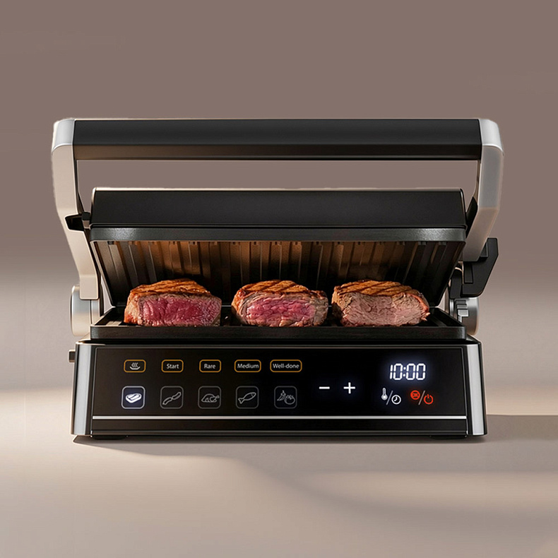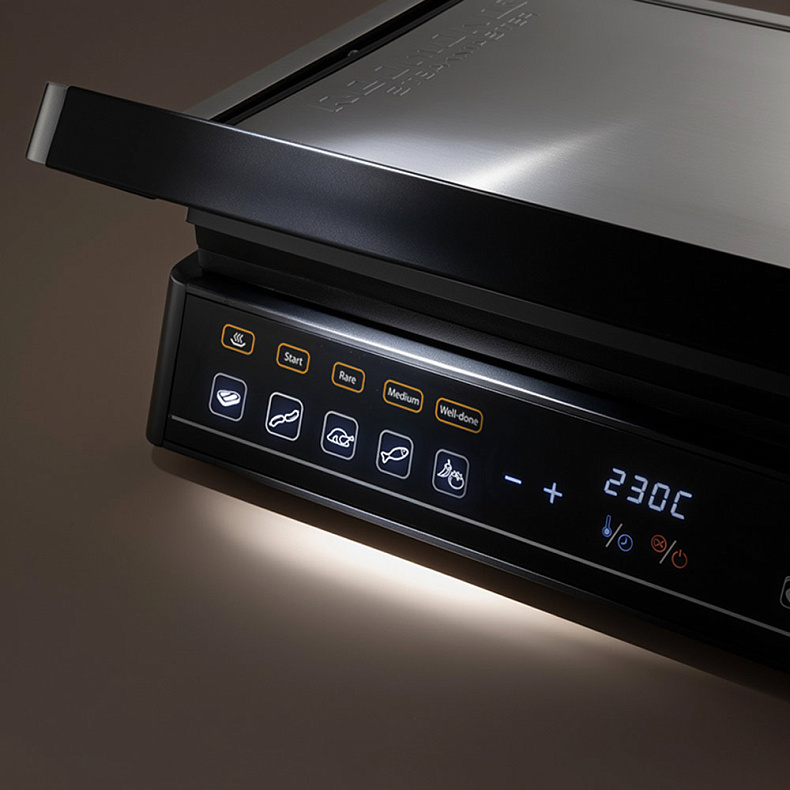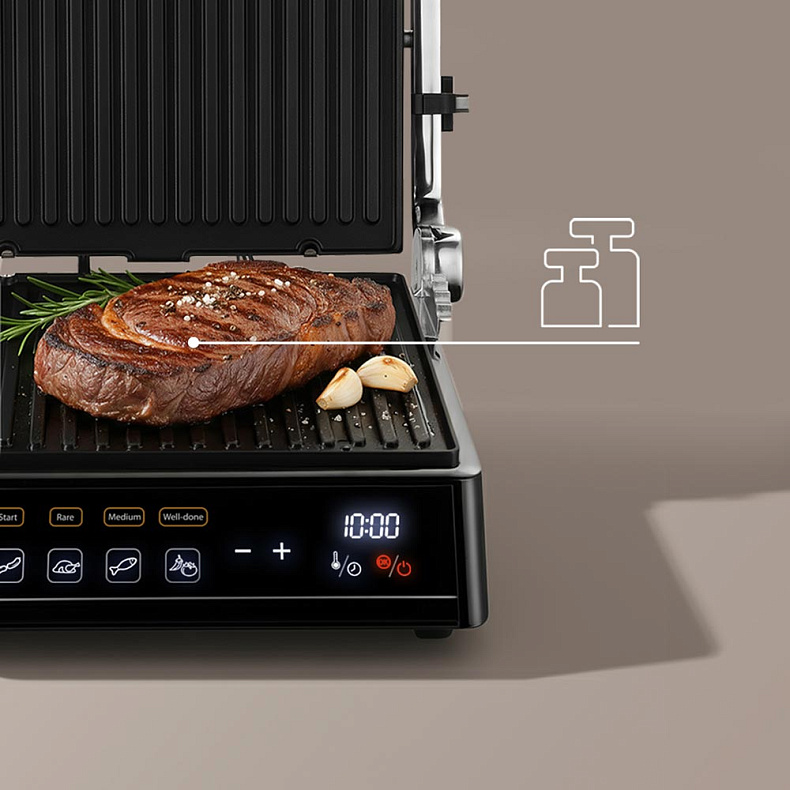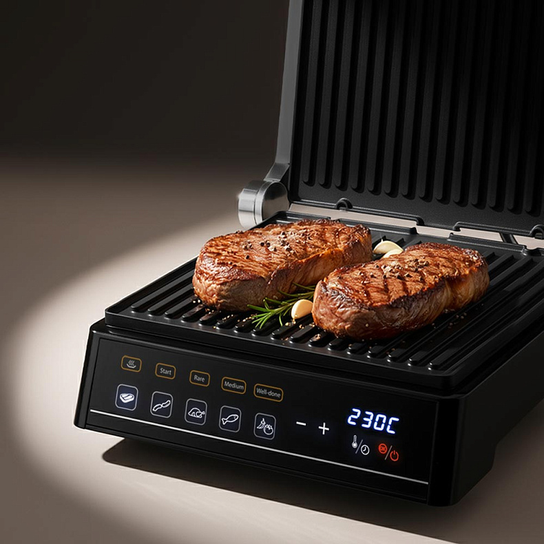 В ручном режиме вы сможете установить нужные вам параметры приготовления. А 5 автоматических программ позволят легко приготовить стейки из говядины (до прожарки RARE, MEDIUM или WELL DONE), сосиски, птицу, рыбу, овощи.