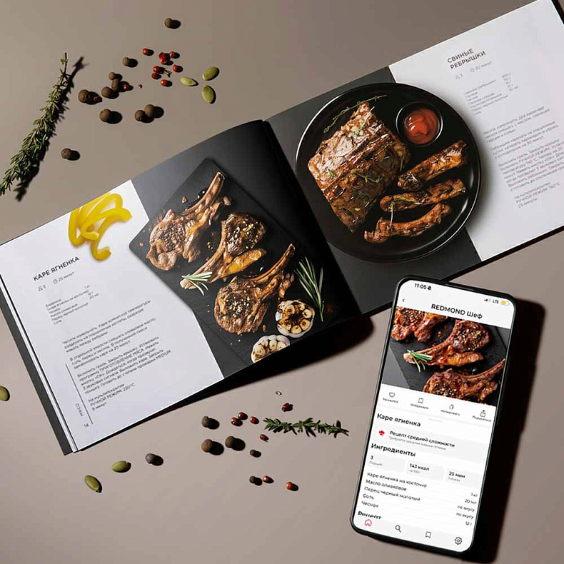 Открывайте новые блюда вместе с фирменным приложением REDMOND Шеф и готовьте как профессионал. В вашем распоряжении более 20 000 рецептов — от быстрых завтраков до эффектных ужинов для гостей. Удобный формат в телефоне и книга рецептов специально для SteakMaster GM305 помогут легко выбрать идею и повторить ее. Готовьте разнообразно и вкусно.