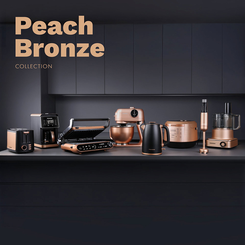 Кофеварка CM720 выполнена в элегантном черном корпусе с элементами трендового бронзового цвета. Она станет изящным дополнением любой кухни. Соберите всю коллекцию техники Peach Bronze: гриль GM303, электрический чайник KM240, кухонная машина FM615 и комбайн FP608, а еще тостер T901, мультиварка RMC-450, блендер BH403.