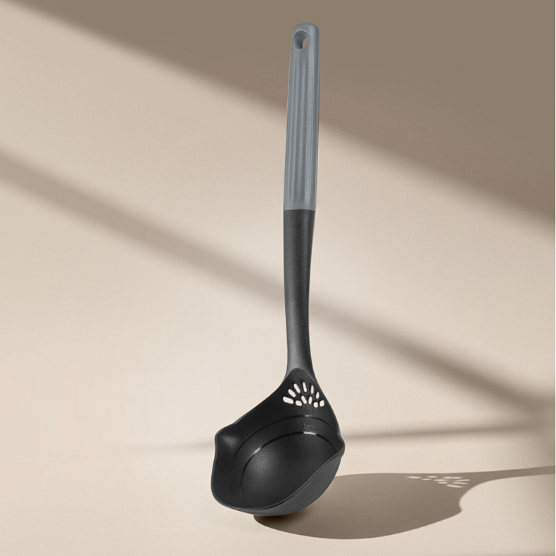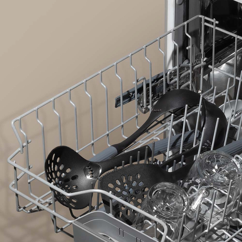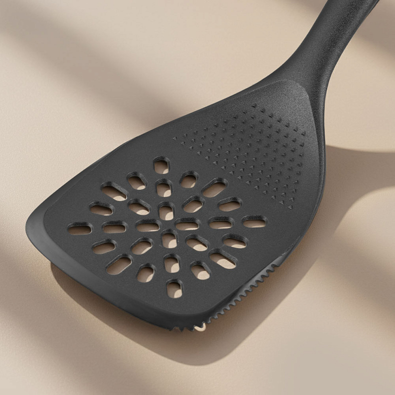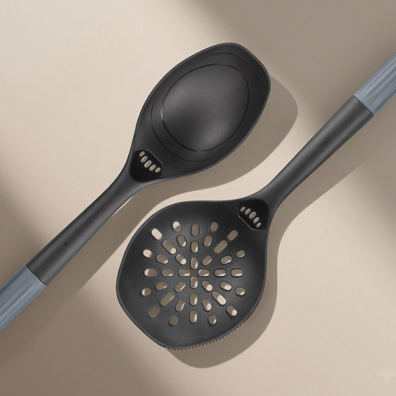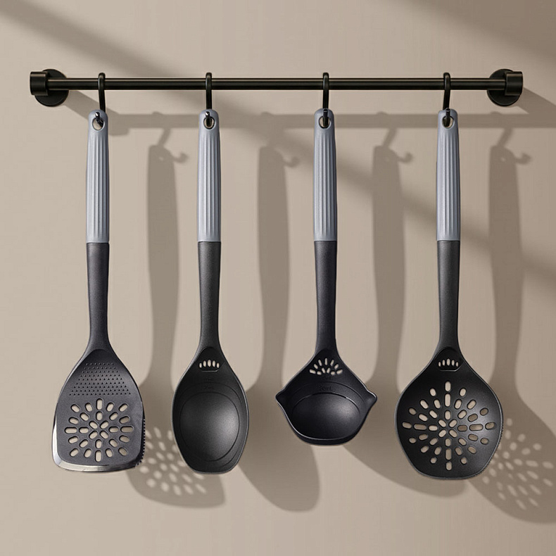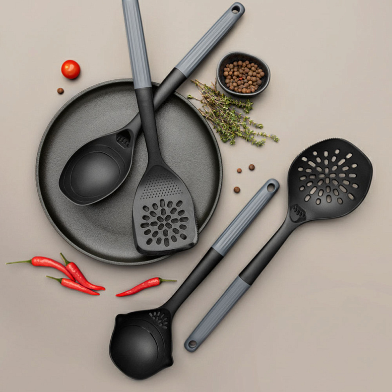 Рабочая часть изготовлена из высокопрочного пластика без содержания вредных веществ. Материал безопасен при контакте с пищей, не впитывает запахи и выдерживает температуру до 180 °C, что позволяет использовать аксессуары для горячих блюд. Кухонные принадлежности не царапают антипригарное покрытие посуды, а ручки с антискользящей поверхностью обеспечивают надежный хват.