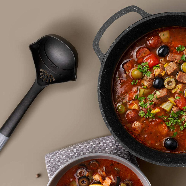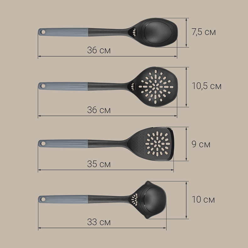 Продуманная длина и ширина каждого инструмента обеспечивают комфорт в использовании и подходят для кастрюль и сковород разного объема.