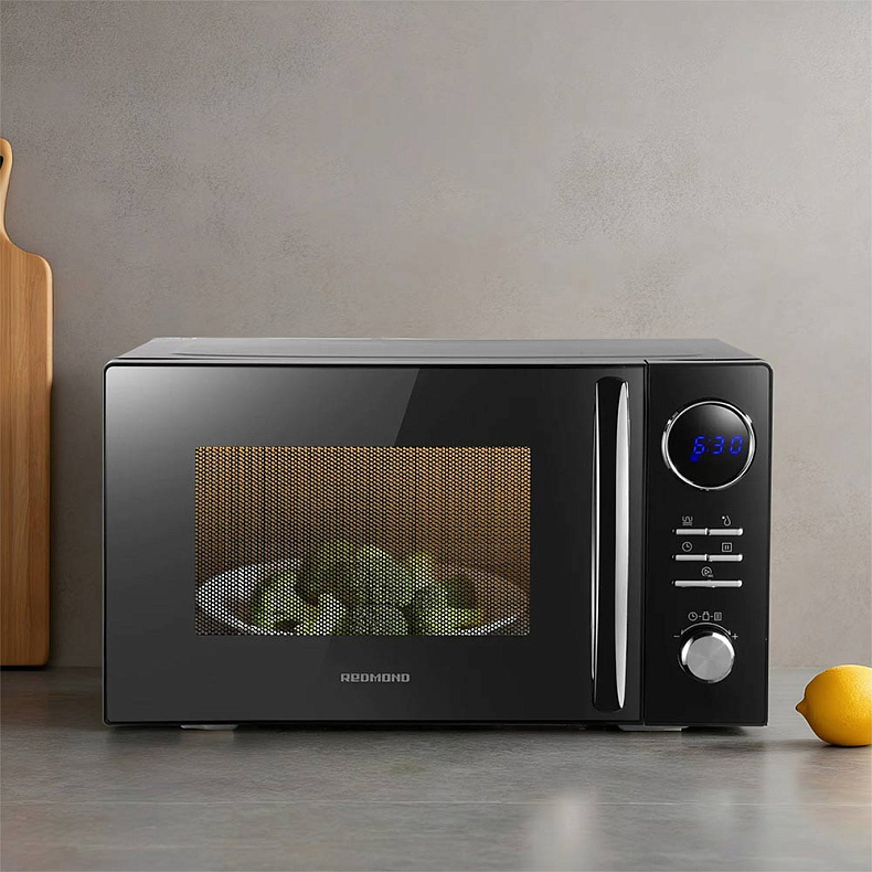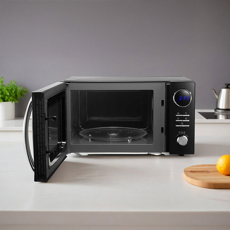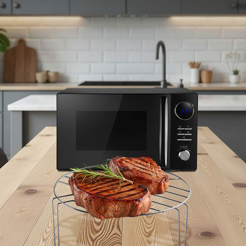 Микроволновая печь подходит для разогрева как небольших порций, так и полноценных блюд. Например, в нее поместится курица гриль. А благодаря компактному корпусу место для СВЧ найдется даже на небольшой кухне.