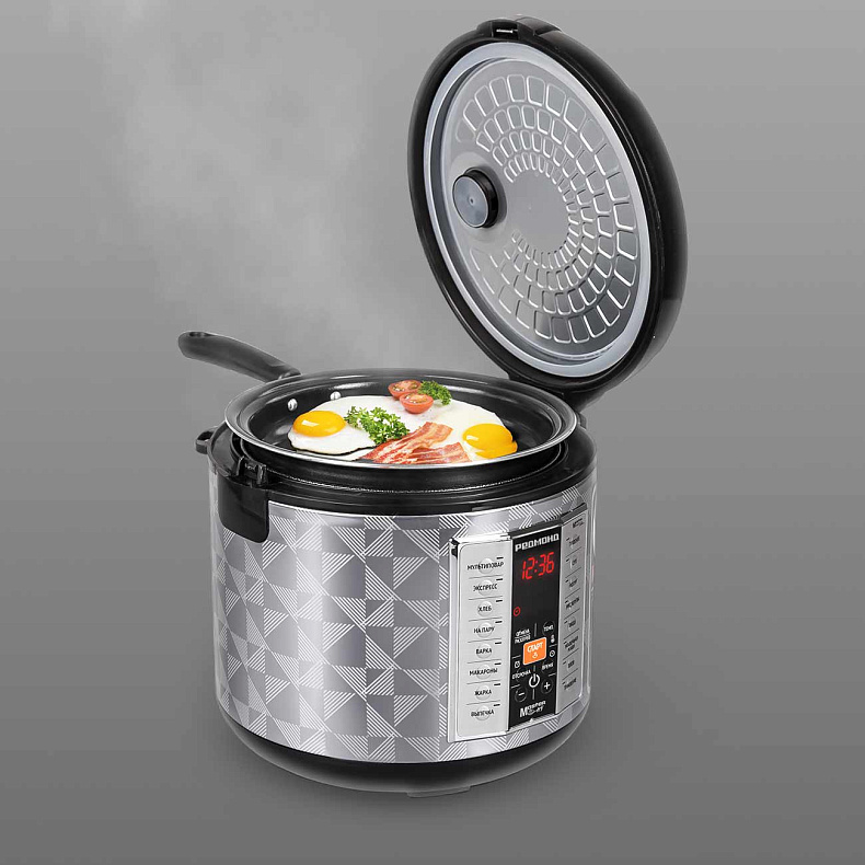 Запатентованный механизм подъема ТЭНа позволяет использовать RMK-M271 как мультиварку и электроплиту. В комплекте к прибору идет сковорода, на ней вы сможете жарить аппетитные блинчики, оладьи, омлет и другие блюда, как на обычной варочной панели.