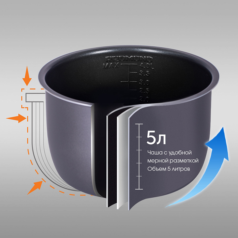 Чаша увеличенного объема позволяет готовить сразу 6–8 порций. Она равномерно распределяет тепло и проста в уходе благодаря антипригарному покрытию. Общий объем (полная вместимость до краев) — 5 литров, а полезный объем для стабильной работы устройства — 4 литра.