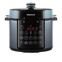Корпус этой стильной мультиварки-скороварки изготовлен из пластика и металлических элементов. Производитель позаботился о пятиуровневой системе защиты и полезных опциях — функции отложенного старта, автоподогрева и разогрева.