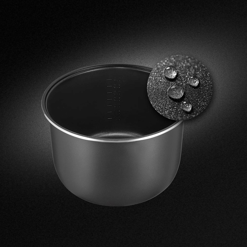 Вместительная чаша рассчитана на приготовление 6–8 порций и подходит для семейного использования. Она изготовлена из безопасных и прочных материалов, обеспечивающих равномерный нагрев и стабильное качество блюд. Антипригарное покрытие предотвращает пригорание ингредиентов и облегчает уход за емкостью. Общий объем чаши (вместимость до краев) составляет 5 литров. при этом полезный объем, рекомендуемый для приготовления, равен 4 литрам, что обеспечивает эффективную и корректную работу прибора.