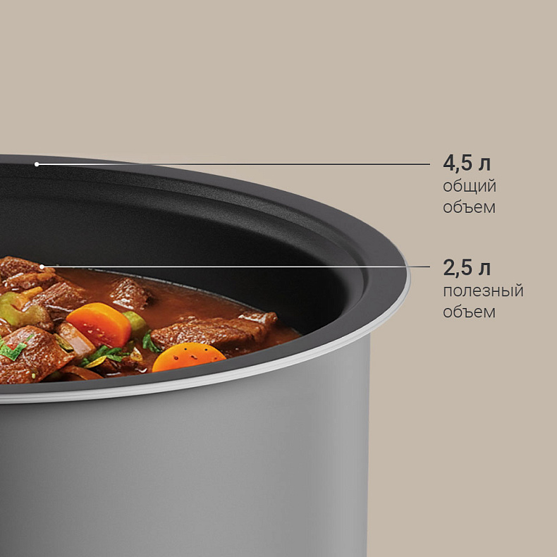 Керамическая чаша обеспечивает долговечность. За чашей с антипригарным покрытием легко ухаживать, так как еда не прилипает к стенкам. А вместительный объем 4,5 литра идеально подходит для всей семьи.