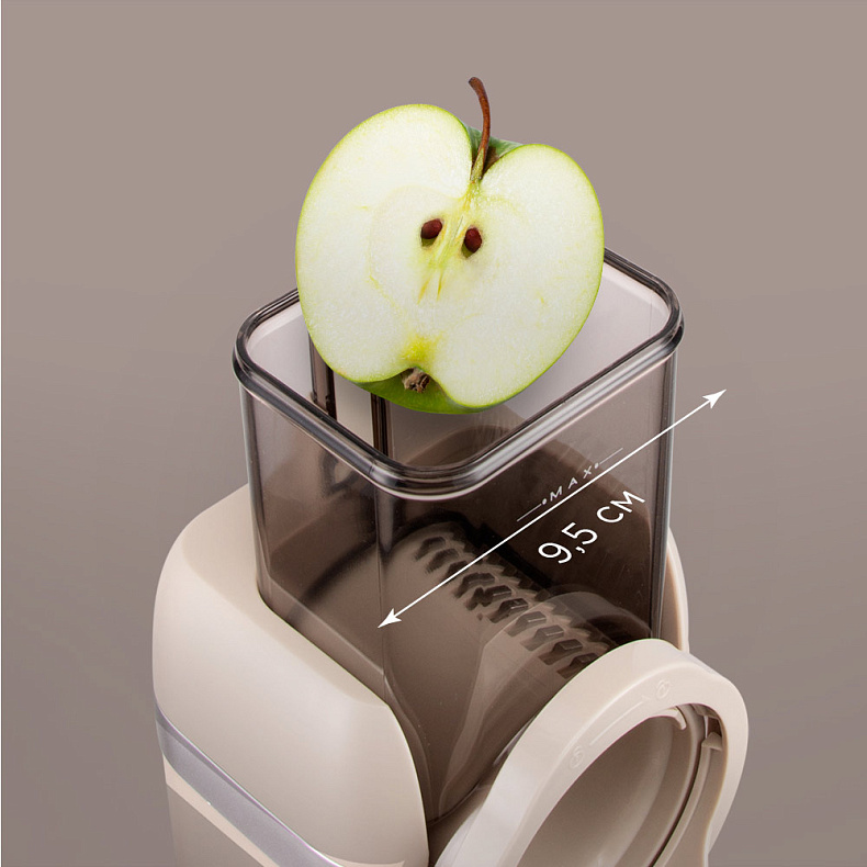 Мультирезка устойчиво стоит на любой поверхности и не скользит благодаря продуманной конструкции ножек. Вы сможете безопасно нарезать продукты, не беспокоясь, что прибор упадет во время работы.