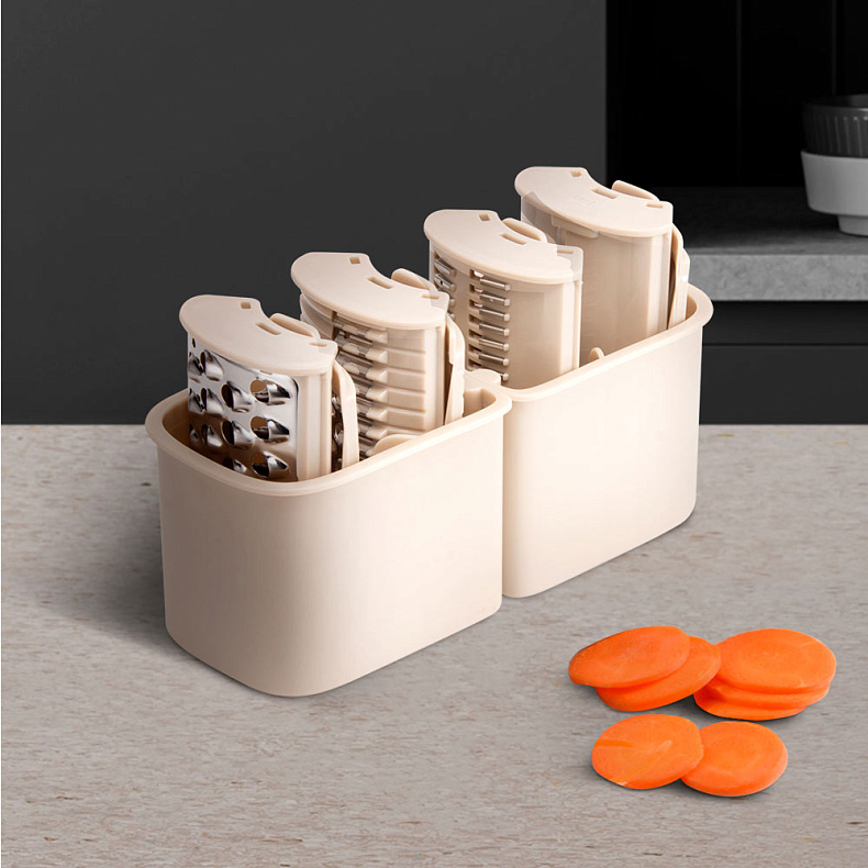 Не нужно думать, где хранить все насадки, в комплекте предусмотрены специальные контейнеры. В один удобно поместить насадку для нарезки кубиками, а во второй – все остальные. На кухне всегда будет порядок, а терки и шинковки не потеряются.