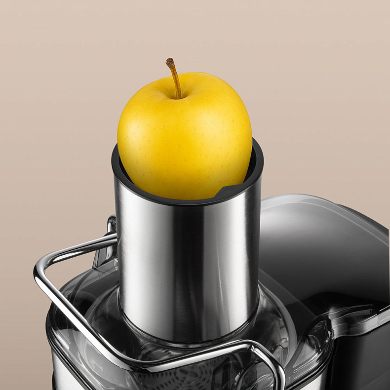 Соковыжималка с широкой горловиной избавляет от необходимости заранее подготавливать продукты. Благодаря диаметру 85 мм фрукты и овощи помещаются целиком. Достаточно удалить косточки и приступить к приготовлению свежего сока.