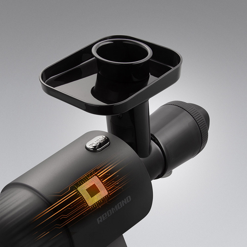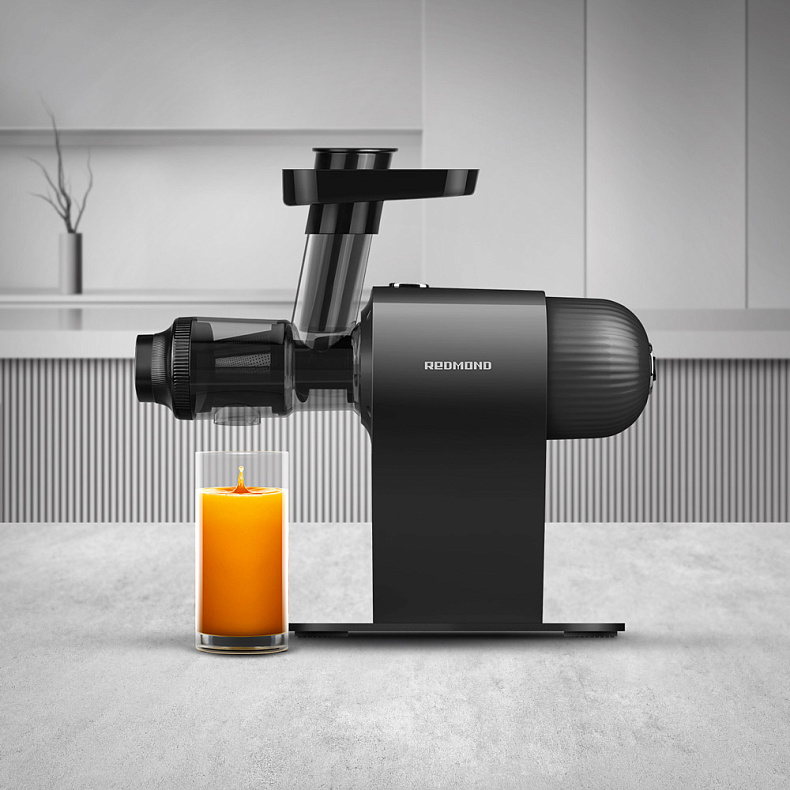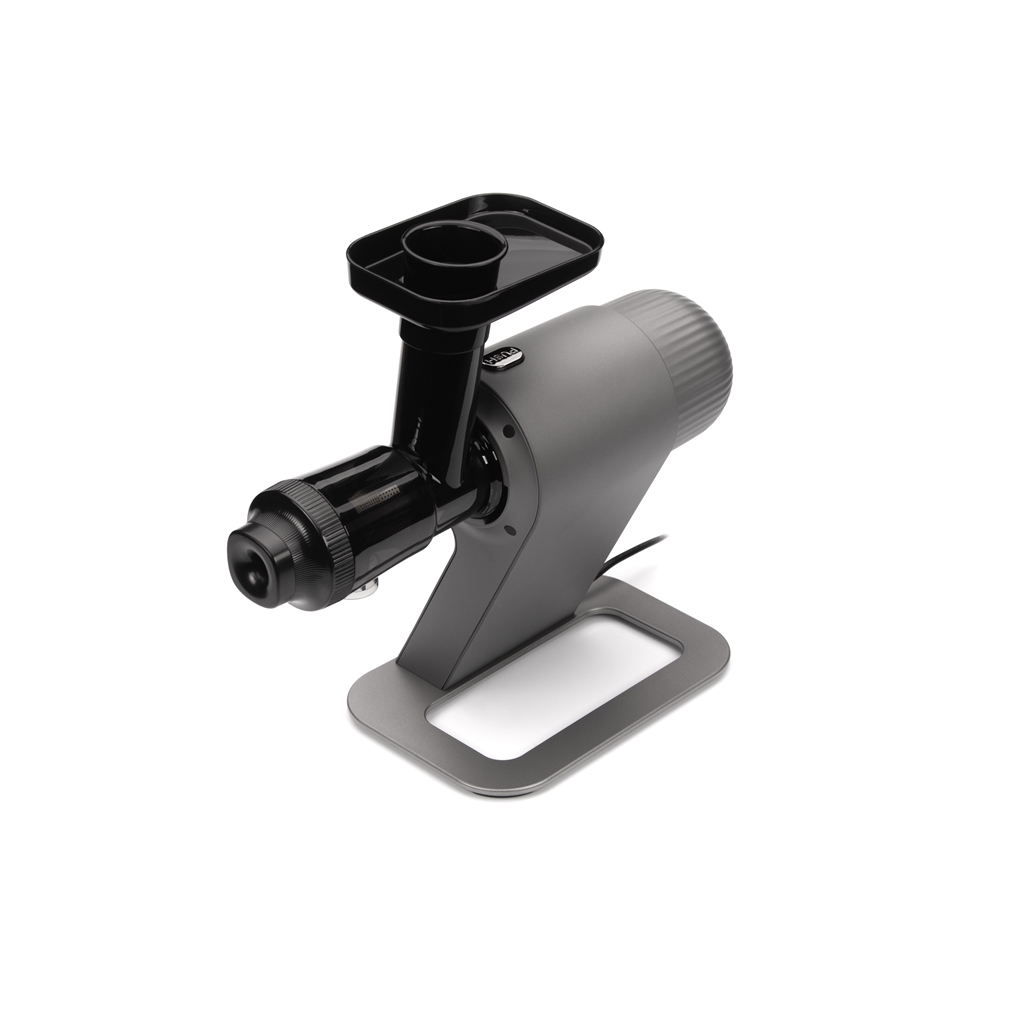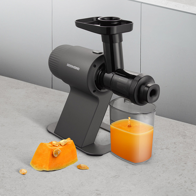 Прибор выполнен в стильном минималистичным дизайне: компактный корпус темно-серого цвета выглядит необычно в сравнении с другими шнековыми соковыжималками. Не займет много места на кухне.