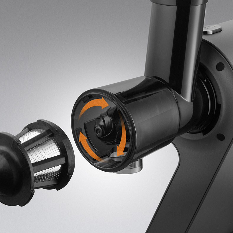 Имеет прочный спиралевидный шнек, который дробит и прессует овощи, фрукты и ягоды. Шнек изготовлен из твердого пластика, поэтому отлично справится даже с твердыми и волокнистыми продуктами.