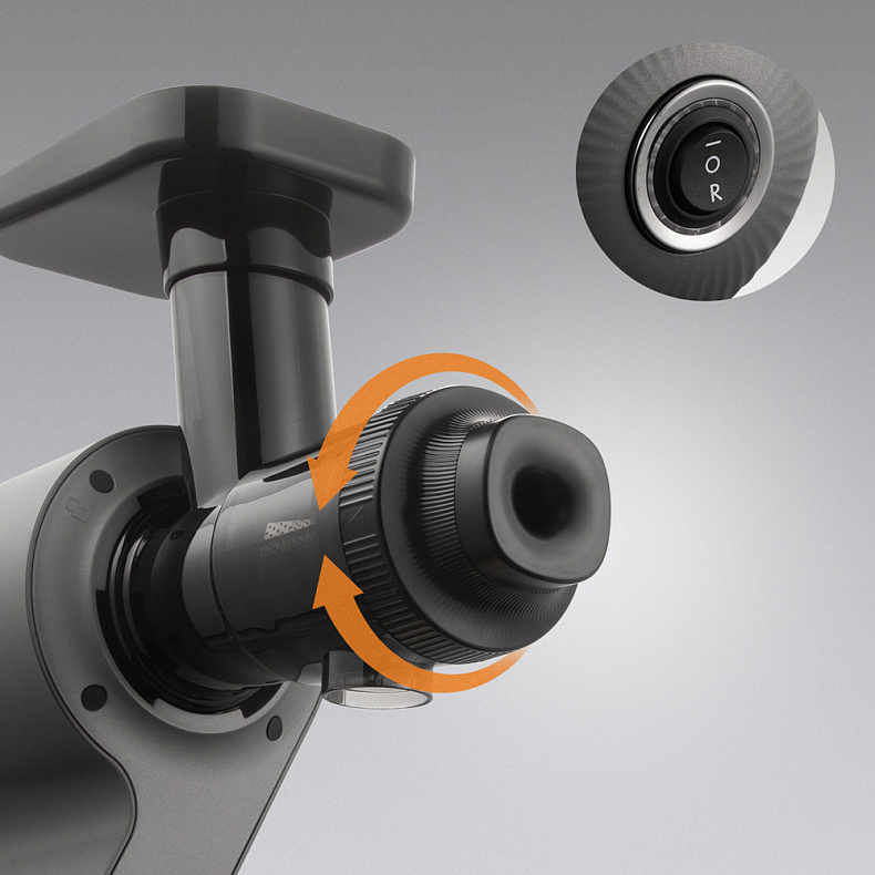 Если в процессе работы в механизме застрянет кусочек яблока или груши, то можно включить функцию реверса: шнек начнет прокручиваться в обратную сторону и проблема решится.