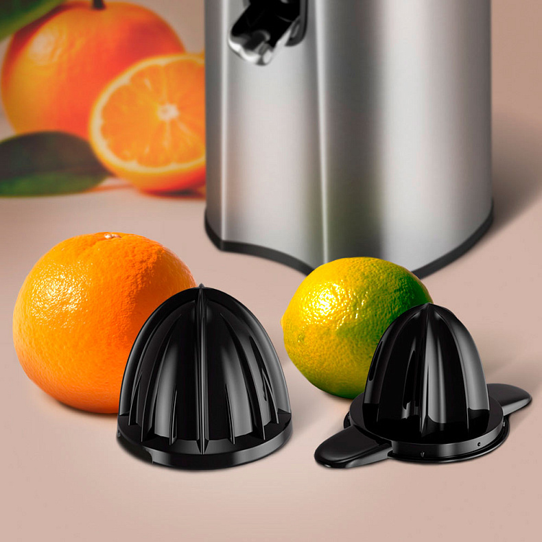 Насадки-конусы в комплекте позволят получить максимум сока из любых цитрусовых. Большая насадка подходит для апельсинов и грейпфрутов, малая — для лимонов, лаймов и мандаринов. При выборе крупной насадки наденьте ее на малую. Наслаждайтесь натуральным вкусом свежевыжатого сока с J1427.