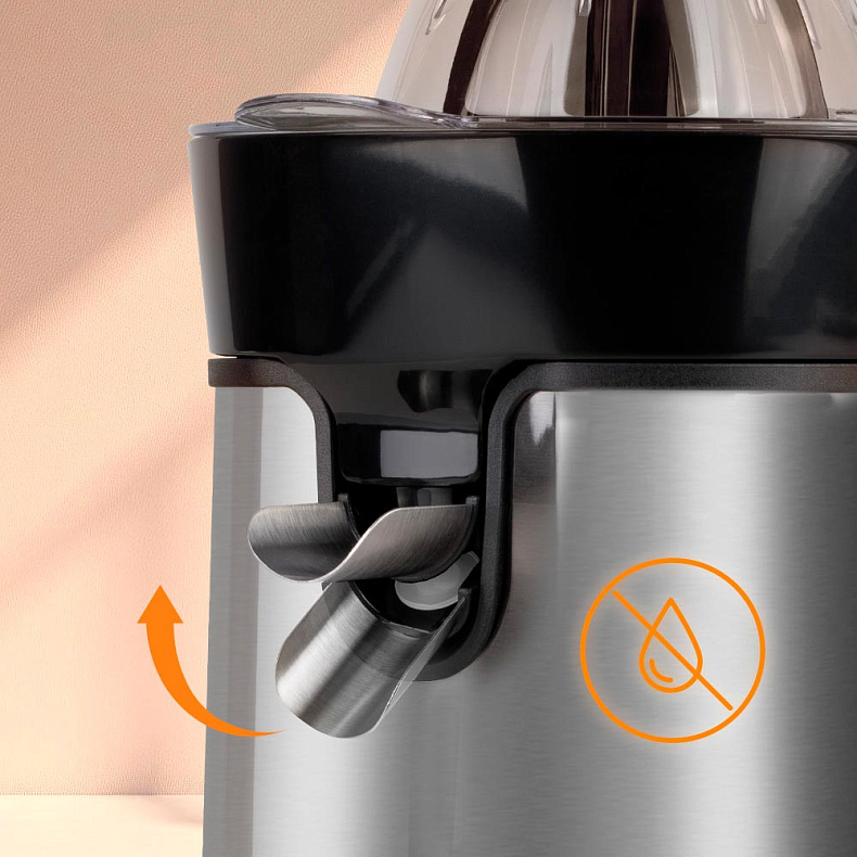 Достаточно поднять носик прибора, чтобы защитить кухню от загрязнений. Система «Капля-стоп» предотвращает вытекание сока из отверстия для подачи после завершения отжима.