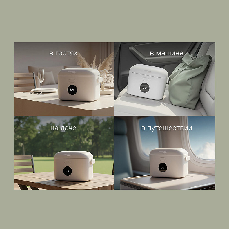 Стерилизатор с автономной работой от аккумулятора до 24 часов дарит уверенность в чистоте где бы вы ни находились. Он легко вписывается в повседневную жизнь: помогает поддерживать гигиену на даче и в гостях, а также обеспечивает комфорт и спокойствие в машине и сопровождает в путешествиях. Компактный, мобильный и надежный. Полная свобода перемещения при любом ритме дня.