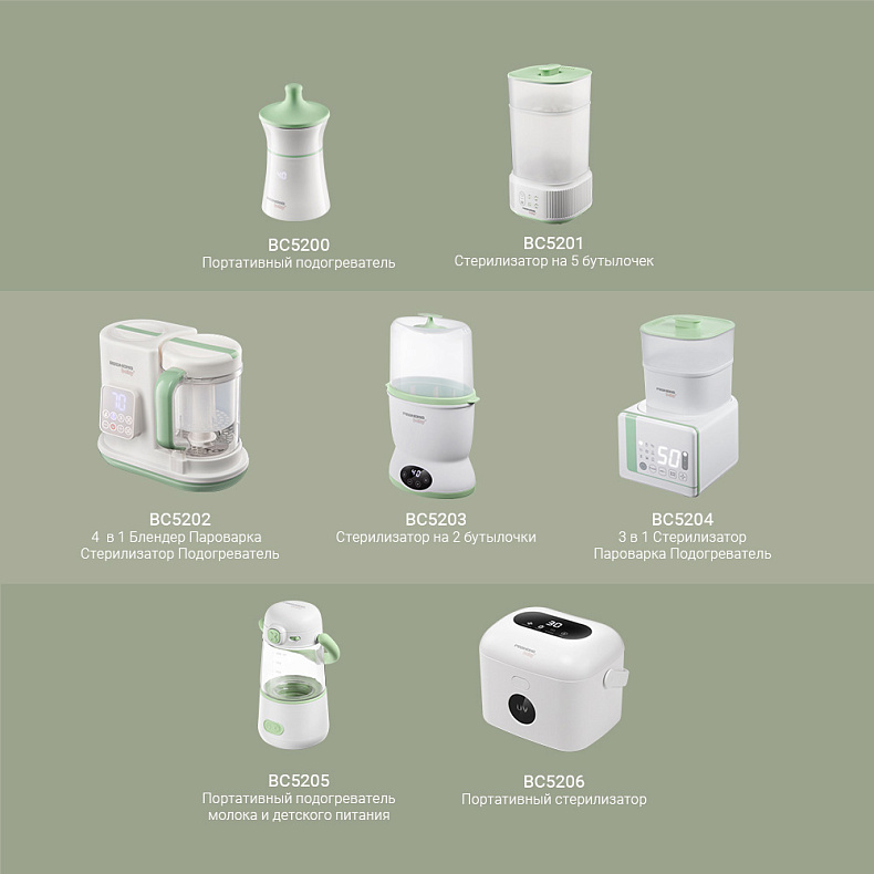 Коллекция «РЕДМОНД С заботой о детях» — для родителей, которые ценят удобство, безопасность и качество. Устройства в едином стиле продуманы и помогают заботиться о малыше каждый день. Портативные подогреватели BC5200 и BC5205 позволяют быстро и равномерно разогреть молоко или детское питание. Стерилизаторы BC5201 и BC5203 гарантируют безупречную чистоту бутылочек и аксессуаров. Многофункциональный прибор BC5202 (4 в 1) объединяет возможности блендера, пароварки, стерилизатора и подогревателя.