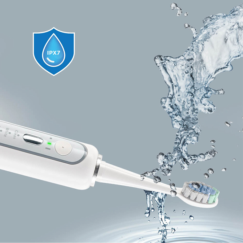 Корпус прибора соответствует стандарту IPX7, что позволяет ему выдерживать кратковременное погружение в воду. Это обеспечивает надежную защиту от брызг и загрязнений. Например, после утренней чистки достаточно промыть устройство под струей воды.