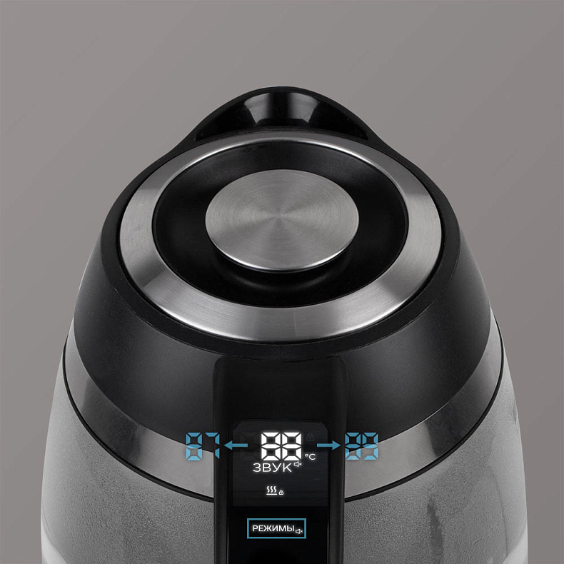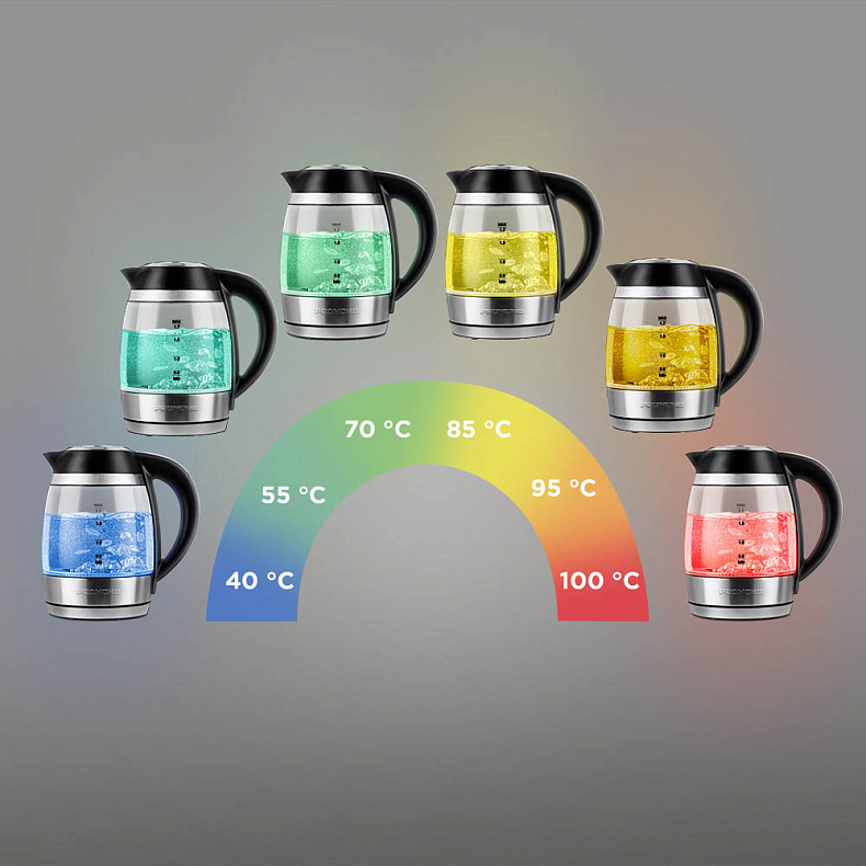 Вы можете визуально контролировать работу чайника. Во время нагрева воды подсветка плавно меняет цвет от голубого до красного в зависимости от температуры (40–100°C).