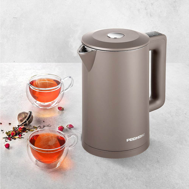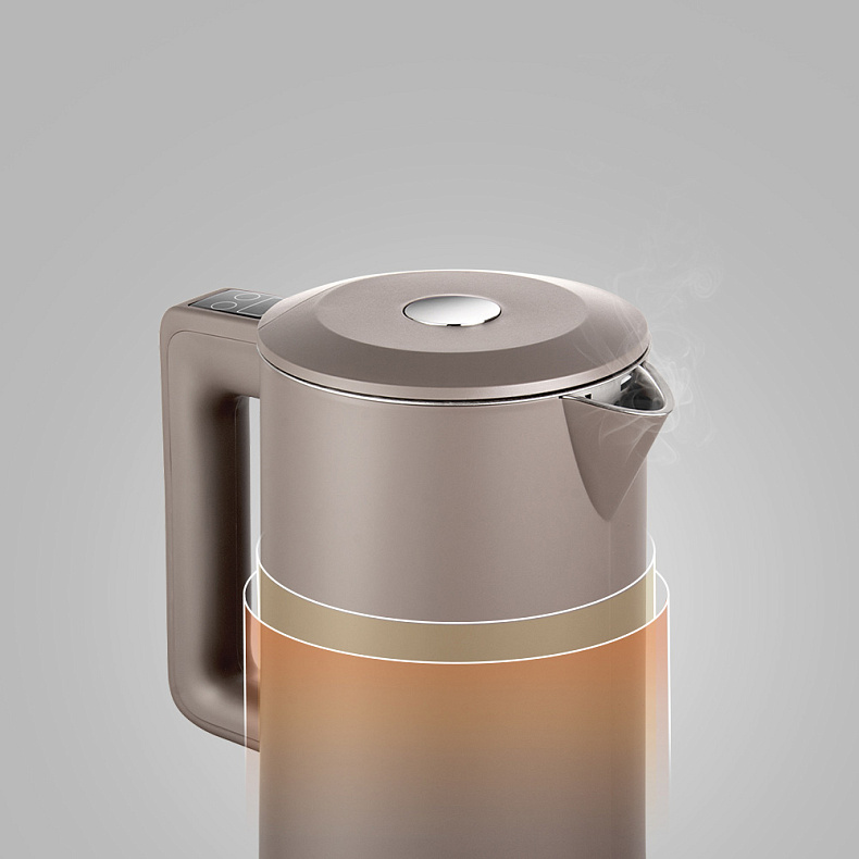 Имеет двойные стенки и работает как термос: дольше сохраняет температуру воды. Внешняя часть чайника совсем не нагревается, поэтому можно не бояться ожогов. Прибор полностью безопасен.
