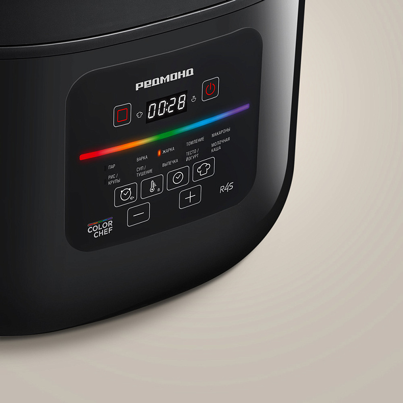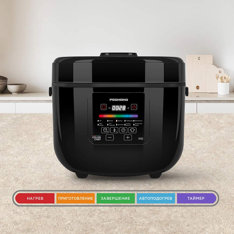 Специальная шкала подсветит отдельным цветом каждый этап приготовления. Если вы на кухне не постоянно и заходите время от времени, то индикация сразу подскажет, что прибор уже нагрелся или блюдо приготовилось.