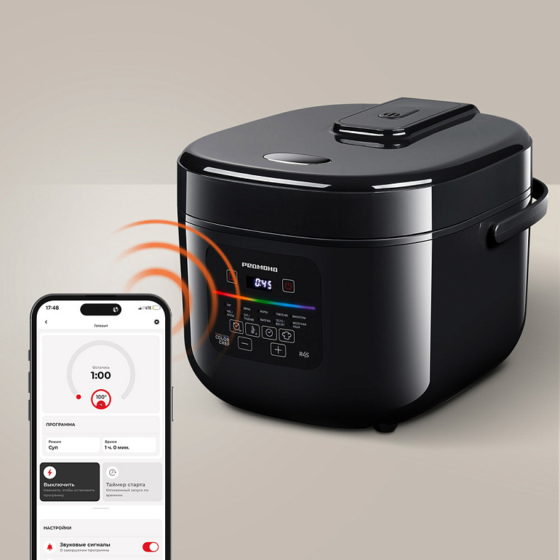 Управляйте мультиваркой из любой точки мира по Wi-Fi. Бесплатное приложение Ready for Sky REDMOND позволит дистанционно запустить программу, отложить начало приготовления, заблокировать панель управления — и многое другое.