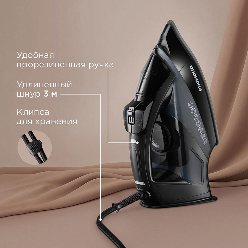 IR1610 — прибор, в котором продумана каждая деталь. Прорезиненная ручка не скользит в руке, удлиненный шнур 3 метра обеспечивает свободу движений, а клипса для кабеля позволяет компактно хранить утюг.