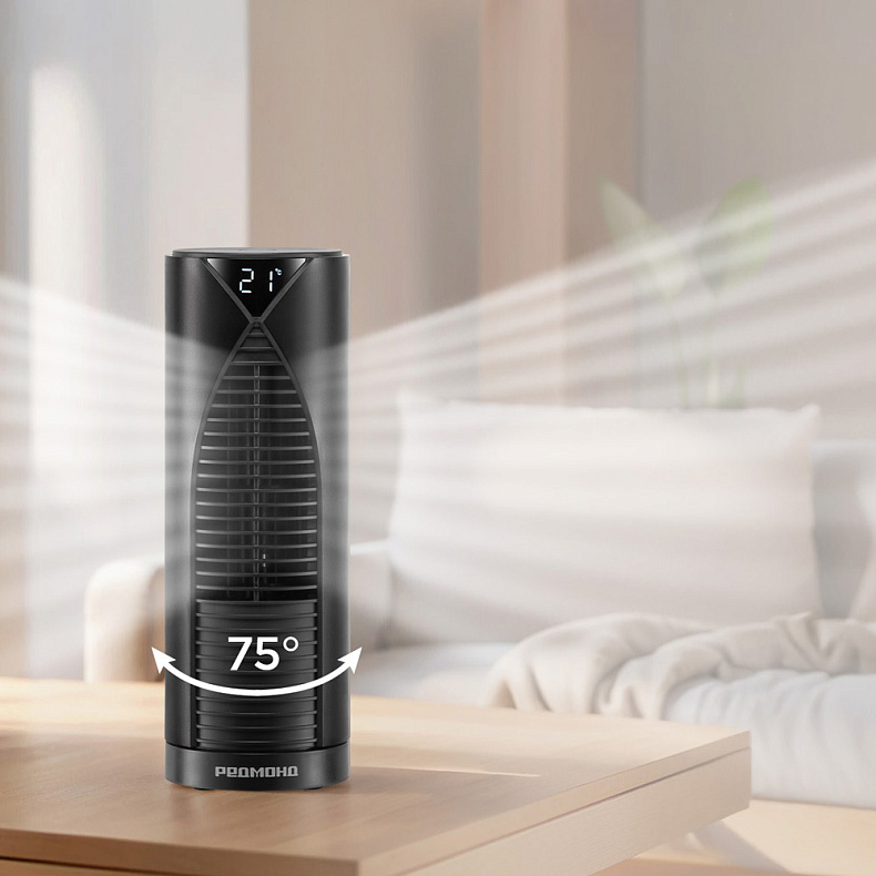 При работе вентилятор может вращаться на 75°, равномерно распределяя воздух по комнате. Эта функция улучшает воздухообмен, увеличивает площадь обдува и создает комфортные условия в разных частях помещения.